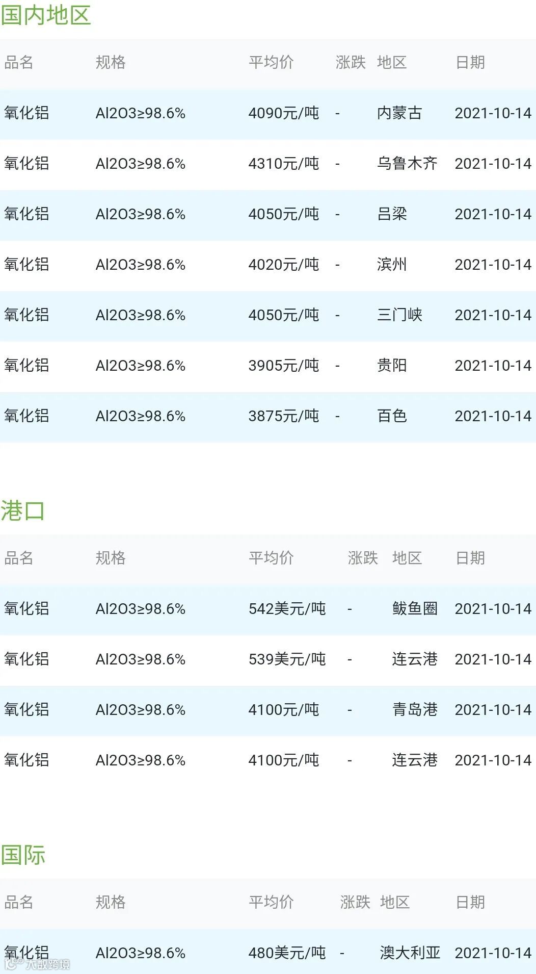 CERADIR先进陶瓷在线2021年10月14日氧化铝粉体材料市场参考价: