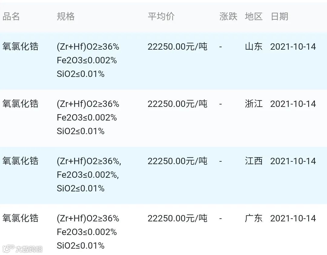 2021年10月14日氧氯化锆材料市场参考价: