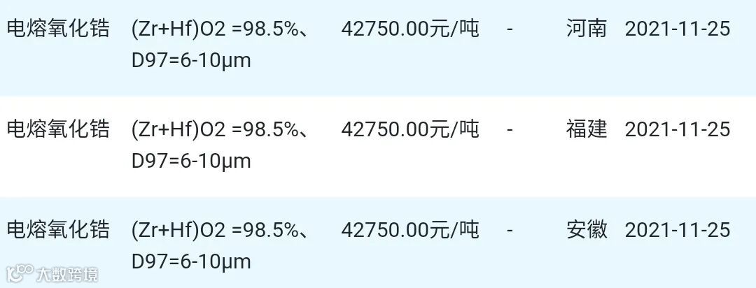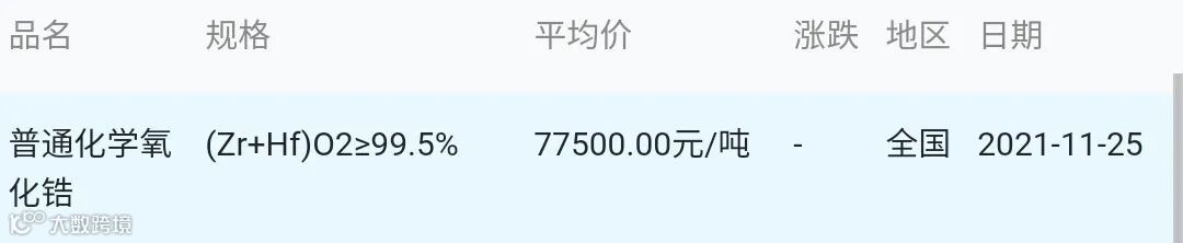 2021年11月25日氧化锆材料市场参考价: