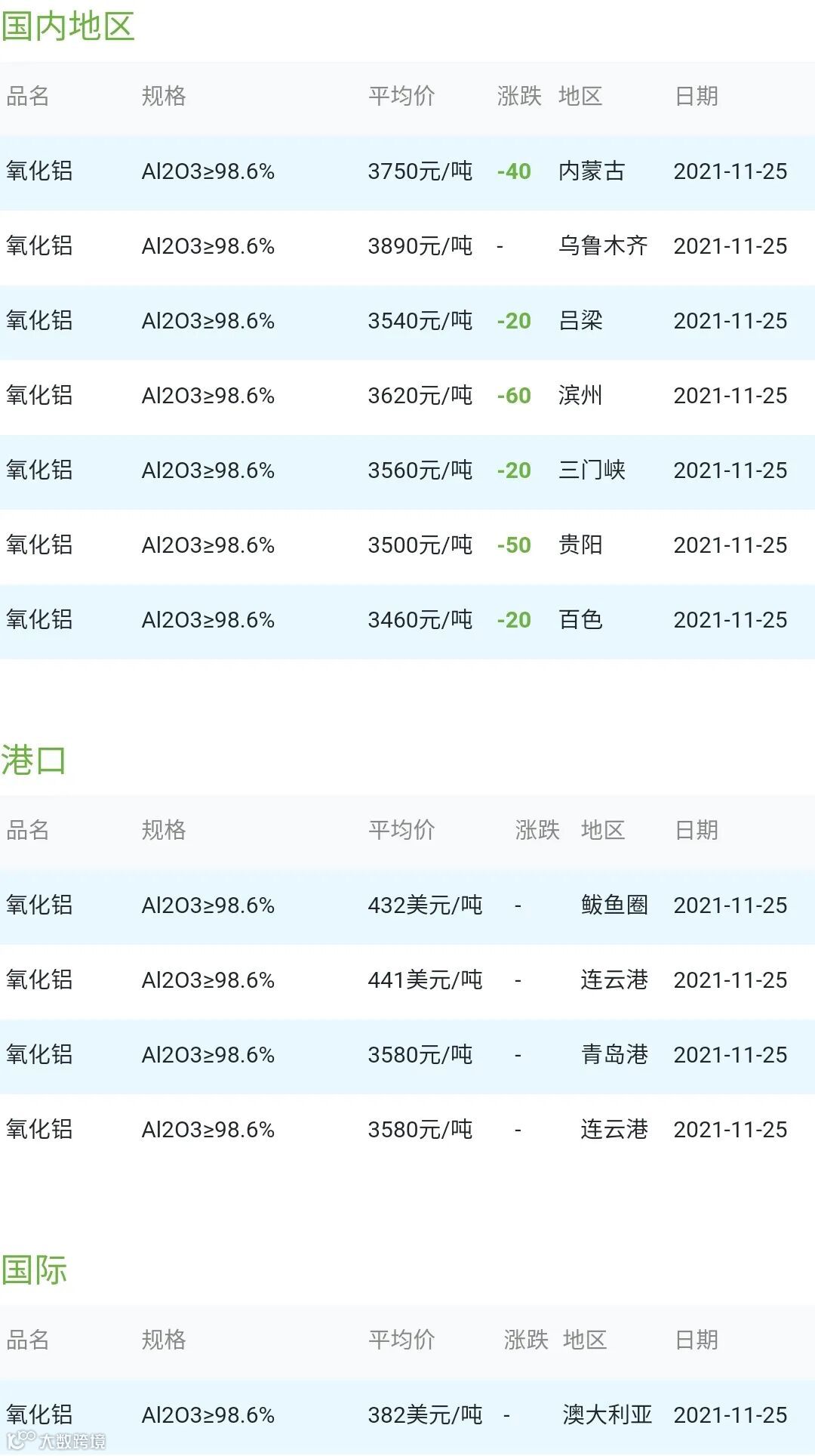 CERADIR先进陶瓷在线2021年11月25日氧化铝粉体材料市场参考价:
