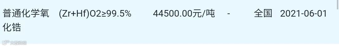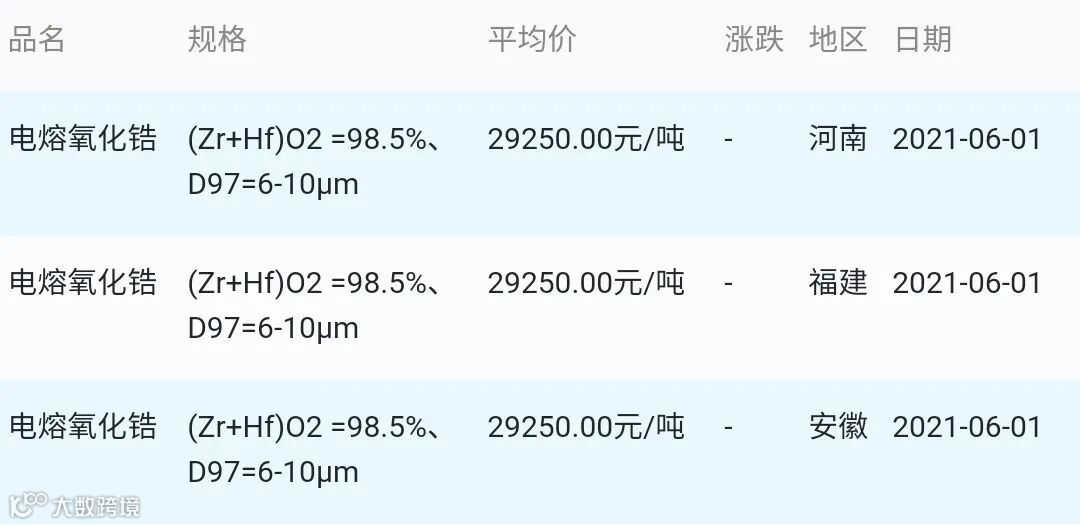 2021年6月1日氧化锆材料市场参考价: