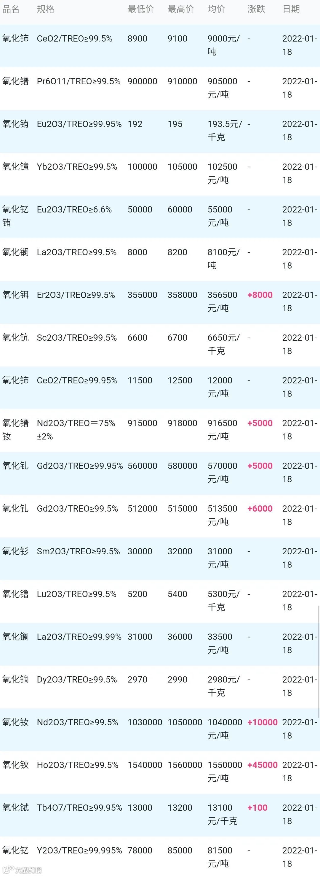 2022年01月18日稀土氧化物材料市场参考价: