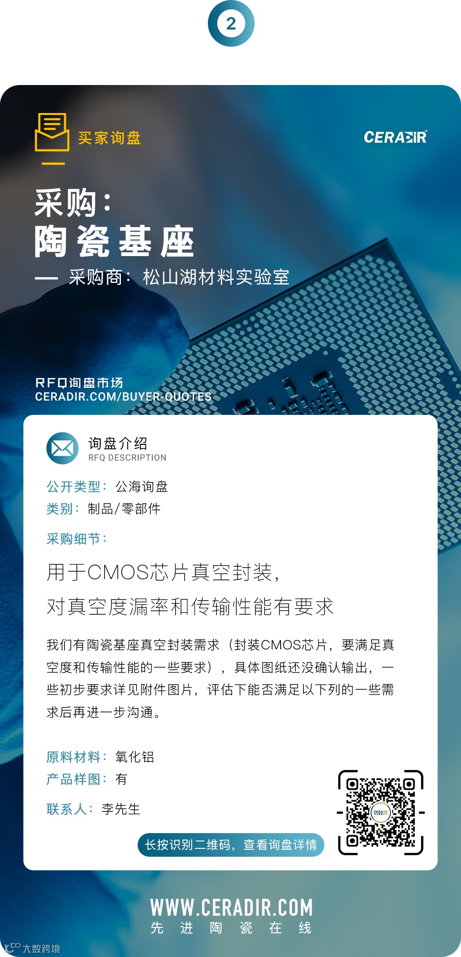 公开类型:公海询盘类别:制品/零部件采购细节:我们有陶瓷基座真空封装需求(封装CMOS芯片,要满足真空度和传输性能的一些要求),具体图纸还没确认输出,一些初步要求详见附件图片,评估下能否满足以下列的一些需求后再进一步沟通。访问