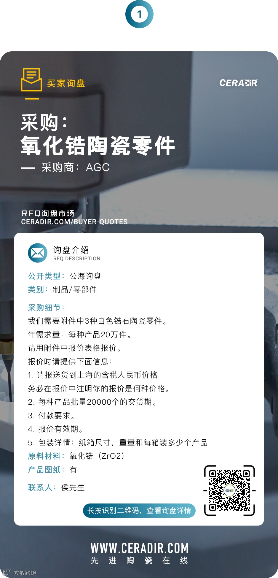 公开类型:公海询盘类别:制品/零部件采购细节:我们需要附件中3种白色锆石陶瓷零件。年需求量:每种产品20万件。请用附件中报价表格报价。报价时请提供下面信息:1. 请报送货到上海的含税人民币价格务必在报价中注明你的报价是何种价格。2. 每种产品批量20000个的交货期。3. 付款要求。4. 报价有效期。5. 包装详情:纸箱尺寸,重量和每箱装多少个产品原料材料:氧化锆(ZrO2)访问