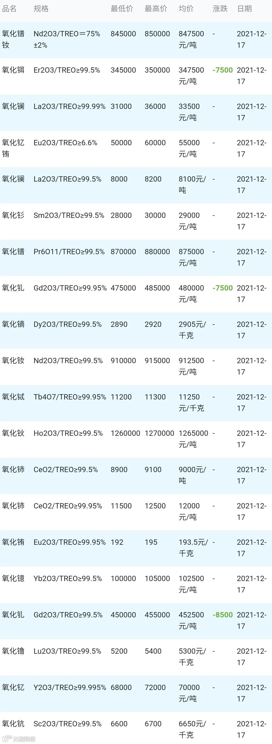 CERADIR:12月17日原材料&稀土氧化物参考价