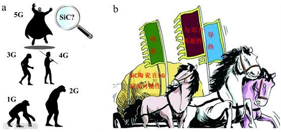 好比人类进化伴随智力发展和工具使用的升级,1G到5G的移动通信革新大体是软件和硬件的升级(图4a)。作为学材料出身的笔者,更关注的是与5G发展相匹配相适应地关键材料(硬件)。5G时代的核心绕不过半导体芯片;而SiC作为最新的第三代半导体材料,助力于5G移动通信发展。5G时代的关键材料中,陶瓷材料也大有所作为[5];那么,当SiC作为陶瓷材料时,能否在5G时代分一杯羹呢?结合5G时代关键材料特点及碳化硅陶瓷性能(图4b),在这里对5G时代下碳化硅陶瓷可能应用浅谈一二。