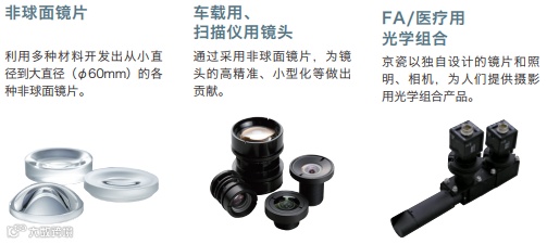 京瓷的光学零部件业务始于1983年,且针对多个行业领域积极推进。京瓷拥有由多种材料制成的、从小直径到大直径、覆盖尺寸广泛镜片的高端制造技术,不光经营应用于车载、OA设备的镜片,还着手用于FA(工厂自动化)设备、医疗设备的光学单元业务。