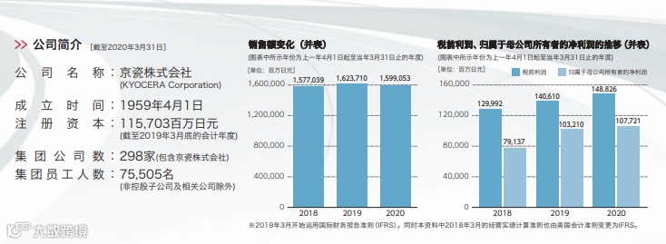 京瓷成立于1959年,公司经营业务主要是以精密陶瓷技术为基础,辐射发展众多产业链, 细分为信息通信市场、汽车相关市场、节能环保市场以及医疗保健市场等四个市场,全方位为目标客户提供有价值的产品和服务。