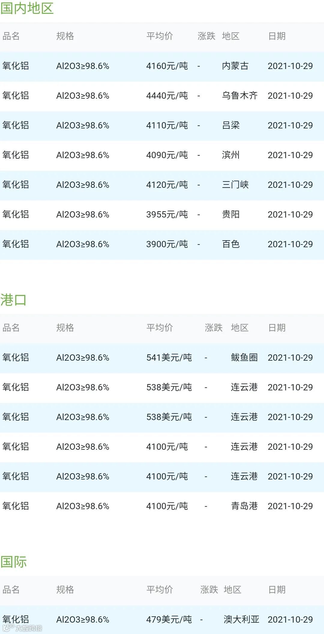 CERADIR先进陶瓷在线2021年10月29日氧化铝粉体材料市场参考价:
