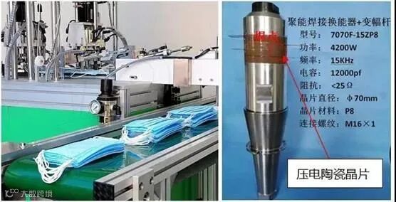 在全世界巨大的使用需求下,全国的口罩机都在满负荷工作,为抗疫作出了巨大贡献。口罩机的工作也离不开压电陶瓷材料。压电陶瓷材料在口罩机中主要作用是将口罩的各部分焊接起来。它的工作过程是,先由振荡电路振荡出高频电信号,然后由压电材料将其转化为高频的机械振动,该每秒上几十万次的振动加上气压缸产生压力通过焊头传导在塑料工件上,使塑料工件的接合面剧烈摩擦后熔化,振动停止后维持在工件上的短暂压力使两焊件以分子链接方式凝固为一体。一般焊接的时间都小于1秒,所得到的焊接强度可与本体媲美。