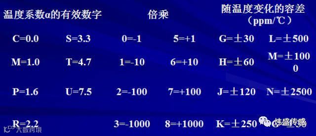 例如,C0G(有时也称为NP0)表示为:第一位字母C为温度系数的有效数字为0,第二位数字0为有效温度系数的倍乘为100=1,第三位字母G为随温度变化的容差为±30ppm/℃,即0±30ppm/℃;C0H分别表示为:第一位字母C为温度系数的有效数字为0,第二位数字0为有效温度系数的倍乘为100=1,第三位字母H为随温度变化的容差为±60ppm/℃,即0±60ppm/℃;S2H则分别表示为:第一位字母S为温度系数的有效数字为3.3,第二位数字2为有效温度系数的倍乘为102=100,第三位字母H为随温度变化的容差为±60ppm/℃,即-330±60ppm/℃