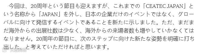 10月15日-18日,CEATEC 2019在日本千叶县幕张国际会展中心举行,主题为“つながる社会、共創する未来(连接社会,共创未来)”。组委会主任鹿野清氏(Shikano Kiyoshi)在接受媒体采访时透露,今年将“JAPAN”删除强调“CEATEC 2019”是欲借20周年庆之势作为展会品牌的全新里程碑,在一下个20周年,CEATEC将越来越国际化。
