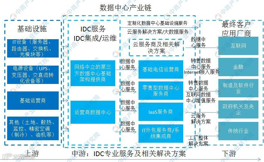 目前,我国重点发展的各大新兴产业,如人工智能、远程医疗、工业互联网等,均需要以数据中心作为产业支撑。数据中心行业应用广泛,上下游产业链条完整。IDC产业链主要由上游基础设施、中游IDC专业服务及相关解决方案(云服务商为主)和下游最终用户构成。