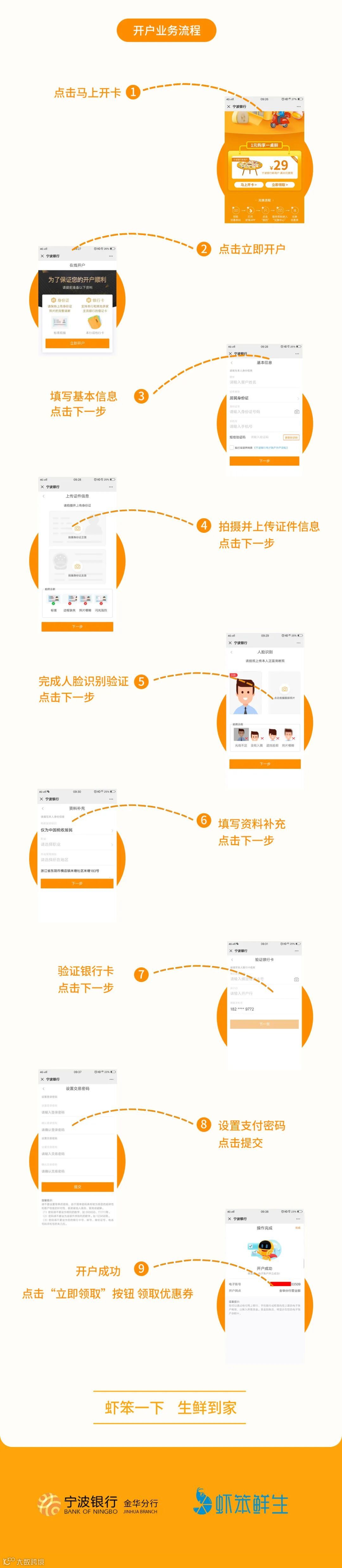 2.新客户:活动期间通过虾笨鲜生活动页面开立的宁波银行新客户(要求客户是从未在我行开卡客户),开通后即刻下载宁波银行新版APP,就可领取一张满30元减29元的优惠券,每位新客户仅可领取一次,名额有限,先到先得。当天注册,当天领券哦!