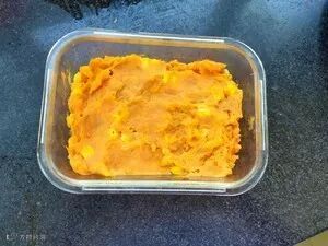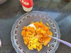 2、剥去皮用勺子碾碎,加甜玉米、牛奶、(黄油、炼乳没有可不放)