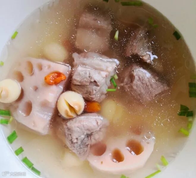 3、排骨放入锅中大火滚开转小火,过半小时放入莲藕,再煲1小时,最后半小时放入莲子和枸杞。加盐调味,撒上葱碎就可以喝了。
