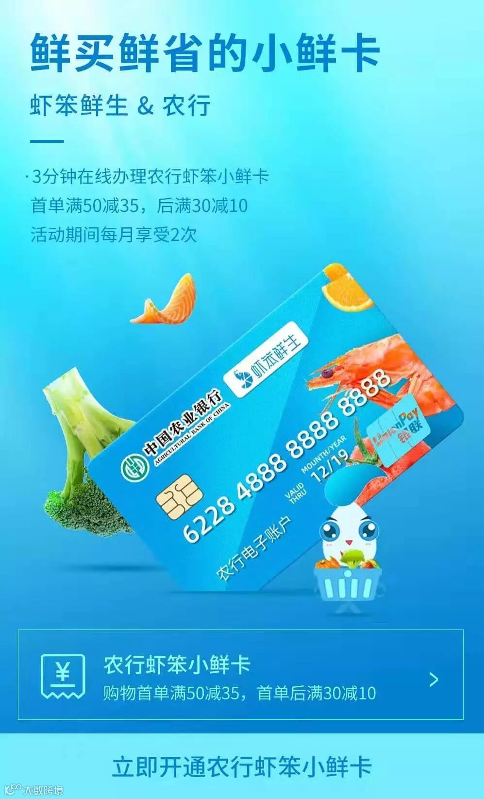 虾笨鲜生与国有三大银行、与农行共同推出虾笨小鲜卡,为用户提供购鲜的长期优惠活动。