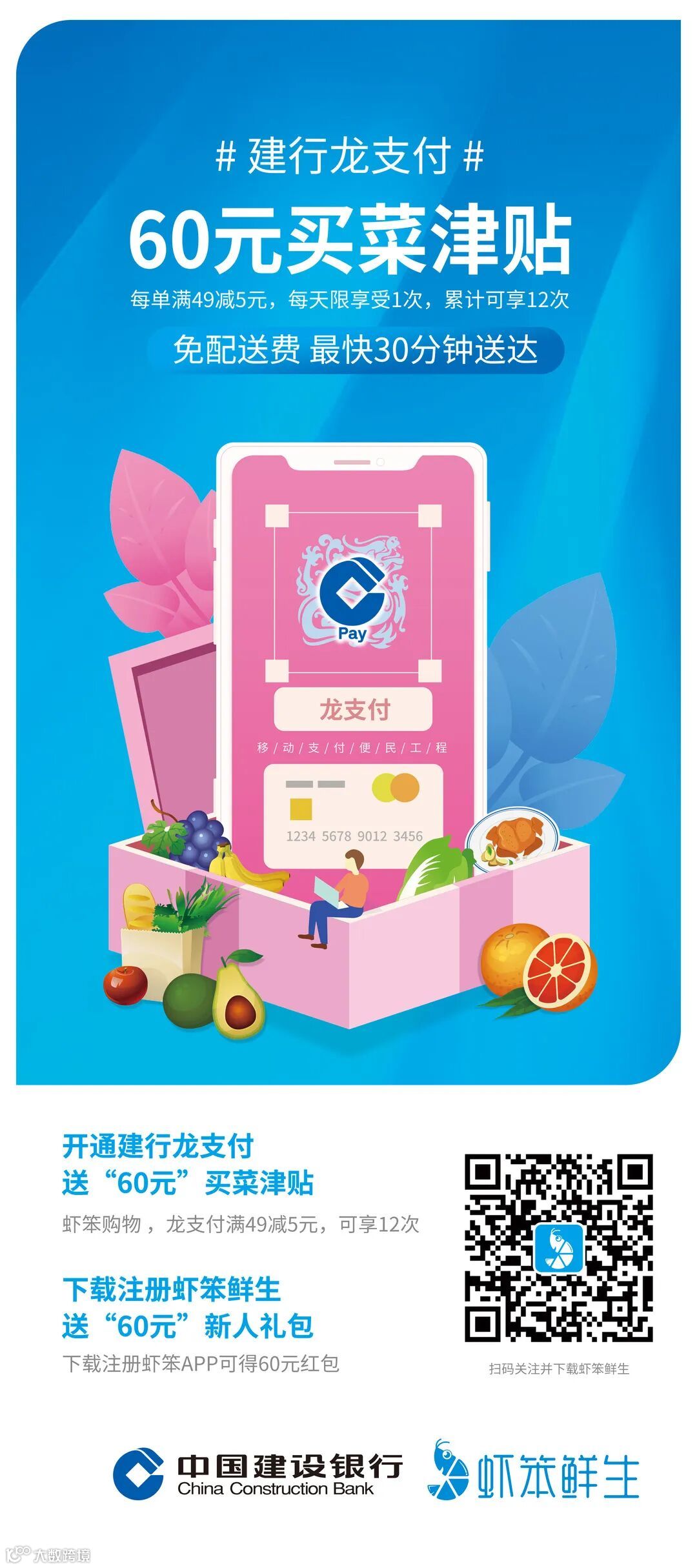 开通建行龙支付送“60元”买菜津贴。虾笨购物,龙支付满49减5元,可享12次。