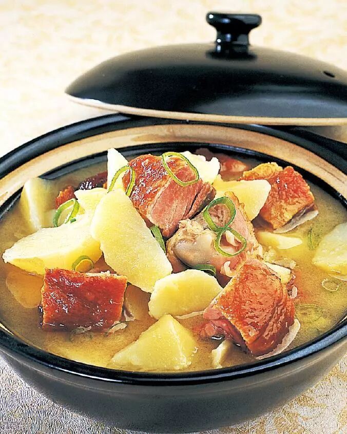 炒锅置火上,倒入色拉油烧热,姜炝香,放入土豆煸炒片刻,放入烤鸭肉同炒,倒入水,调入盐、味精煲6分钟,撒入香葱即可。
