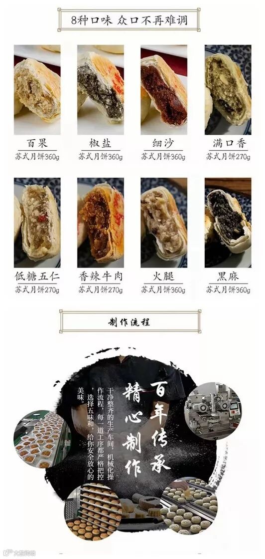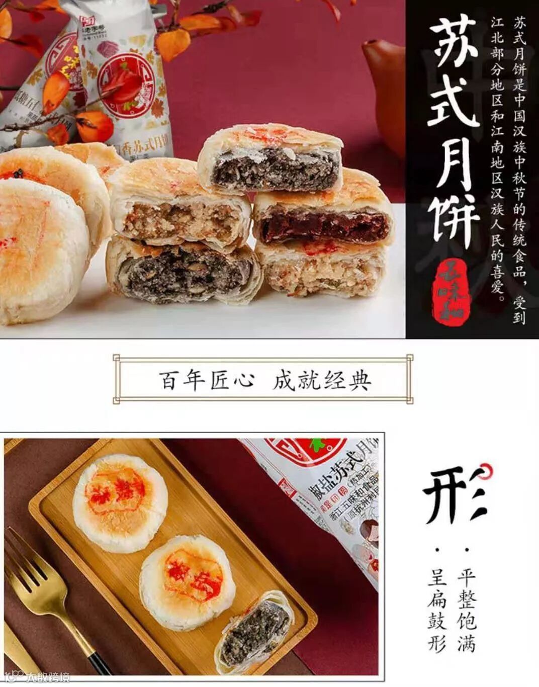 苏式月饼是中国汉族中秋节的传统食品,受到江北部分地区和江南地区汉族人民的喜爱。八种口味,随心选择;平整饱满,呈扁鼓形;厚薄均匀,皮层酥脆;皮薄馅多,果料充足。