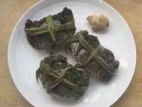 将蟹逐只洗净,放入水中养半天,使它排净腹中污物,然后用细绳将蟹钳、蟹脚扎牢。