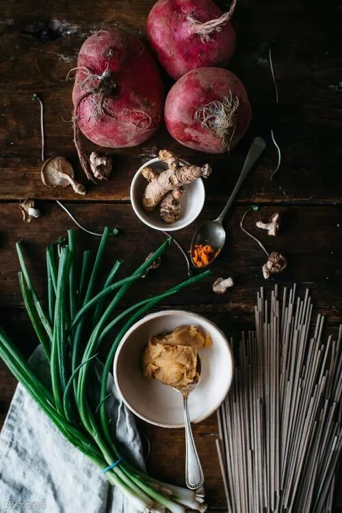 蘑菇味增荞麦面 图片源自www.dollyandoatmeal.com准备:小葱、姜、蘑菇、萝卜、荞麦面、味增酱、高汤