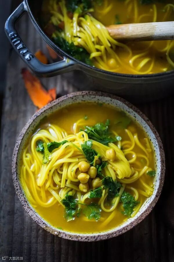 姜黄杂豆面 图片源自www.feastingathome.com3.待开锅后,再将面条放入其中,再次煮熟后即可。4.将面和汤捞出后,再在顶部放上香菜来提味味道更佳。