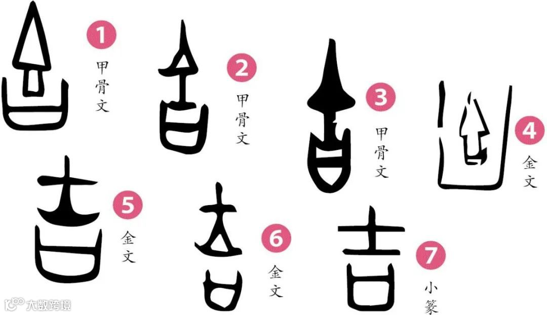 吉,甲骨文字形①,很明显这是一个会意字,但是上下两个字符都代表什么东西,会意的又是什么意思呢?徐中舒先生在《甲骨文字典》中列举了前辈学者的几种解说。