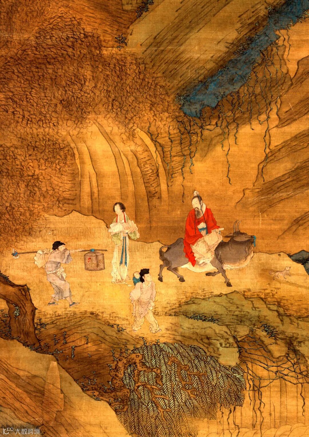 此幅画描绘许真人骑牛,携带家眷和牲口,一齐迁往仙境的情景。许真人,名逊,字敬之,晋朝汝南人,曾当过旌阳令,后来因为世乱而归隐乡野。道教传说,他于135岁时,在洪州西山,带领家人42口连同鸡犬,一齐飞升而去。