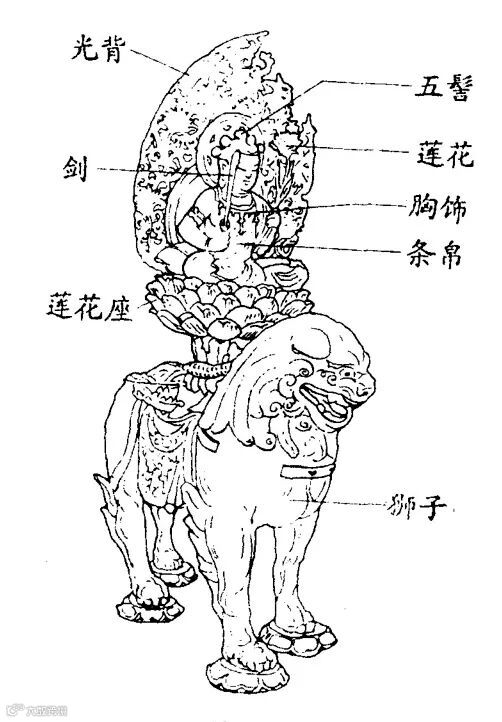以文殊菩萨的造像而言,在佛寺中,他通常以释迦牟尼佛的左胁侍的身份出现。常见的文殊师利塑像,头顶有五髻,象征大日如来之五智(法界体性智、大圆镜智、平等性智、妙观察智、成所作智);左手执莲花,莲花上安放一部《般若经》,象征般若一尘不染,如同大火汇聚,四面均不可触,触之即燃烧;右手持宝剑,象征智慧如同金刚宝剑一般锐利,能够斩断群魔和一切无明烦恼。文殊菩萨造像,有的坐于莲花台,表示清净;有的乘狮子或孔雀,表示威猛。(见图一)
