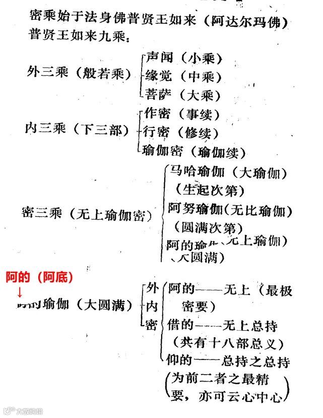 “生起马哈瑜伽者,如诸法之体,教传阿努瑜伽者,如诸法之道;圆满阿的瑜伽者,如诸法之果。”
