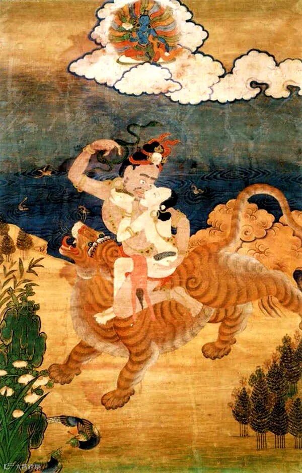 这幅唐卡所绘的是宗比巴。宗比巴拥抱着明妃,骑在一只雌虎背上;左手持一个甘露钵,右手中有一条绿色的蛇,传说宗比巴就是用这条毒蛇来作鞭子驱策身下的猛虎。明妃的手中也持一只甘露钵,将其递到宗比巴面前。唐卡的右下角有一片缩小的树林,暗示出宗比巴生活的地方。左下角则是绿色的山石,石间花草丛生,旁边站着两只孔雀。宗比巴的身后是一片湖 泊,湖中泛着涟漪,有鸭子在水中游动。上方的白云中坐着的是身披虹光的蓝身度母。整幅唐卡色彩搭配技巧运用得非常娴熟,看上去十分漂亮。