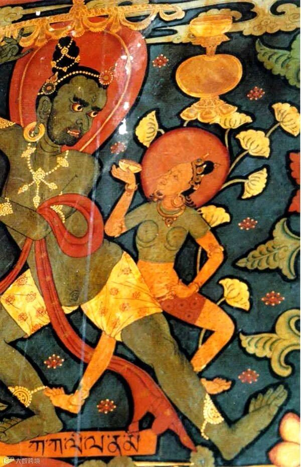 这幅壁画所绘的是吉嘎力巴。吉嘎力巴头戴骨制饰物,身着短裤,左臂之上绕有一条红色的披肩。他的身边有一名女子,可能是他的妻子。女子手持一只嘎巴拉,为吉嘎力巴奉上甘露,她的头上有红色的光轮,上方为一只空着的长寿瓶。二人做出跳舞的姿势,说明吉嘎力巴对妻子不能割舍的感情。