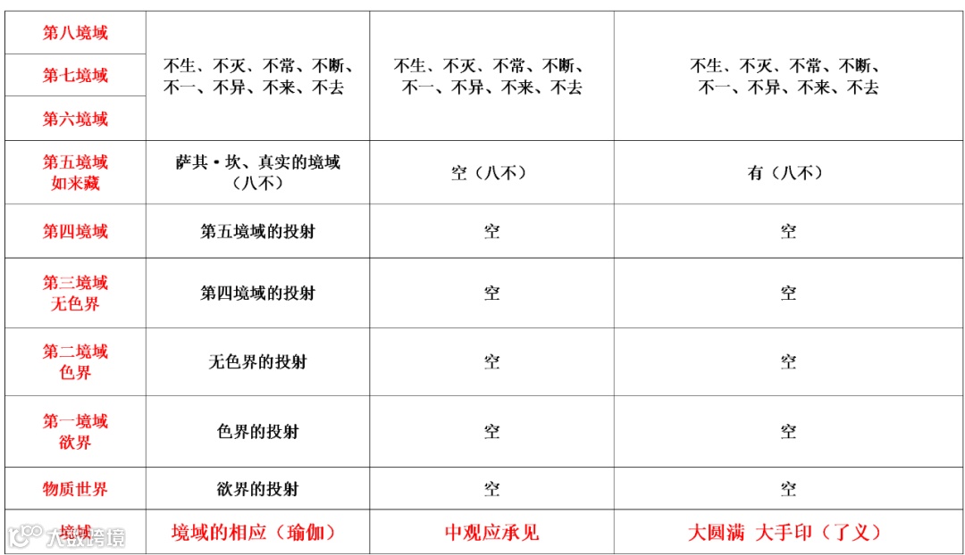 所谓“见(地)”,必须是站在在一个实修等级或境域来说的,宁玛、噶举站在究竟的层面(第五境域、如来藏),其他境域都只是究竟层面(第五境域、如来藏)的投射,为“空(不实存)”;从上面图表(空性见地比较表)可以看出,格鲁主张的中观应承见“一空(不实存)到底”,将“空(不实存)”绝对化,导致第四境域及以下境域失去了(相对)“存在”的依据——第五境域尚不存,何来第五境域的投射(第四境域)?
