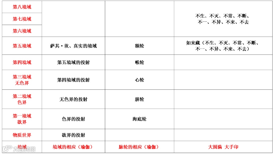 所谓“见(地)”,必须是站在在一个实修等级或境域来说的,传统上显密都用了义不、了义来区分,实际上这是明显不够精微的。行人实修至第一境域到第五境域每一境域的时候,其见地都不会一样;而行人的见地也会呈现其所达至的境域,(所以禅宗多用见地来衡量行人的修证水平)。从图表中可以看出,“源头”(如来藏)这个见地在第五境域,是实证第五境域后的见地。