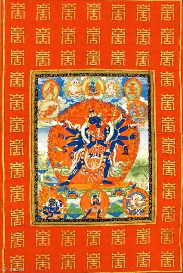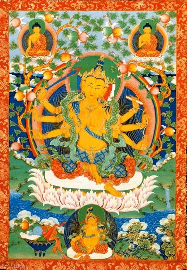 这幅唐卡所绘的是黄色身文殊菩萨。文殊菩萨四面八臂,袒露上身,以左舒式坐于白莲宝座之上;他头戴五叶宝冠,面目慈祥;两条主臂举于胸前,双手结说法印;其余右手执杵、箭及剑,其余左手执铃、弓及经。画面上方为迦叶佛和誓言三尊,下方为增禄佛母。文殊菩萨与寂天菩萨渊源颇深,后世的许多高僧都认为寂天菩萨是文殊菩萨的化身。