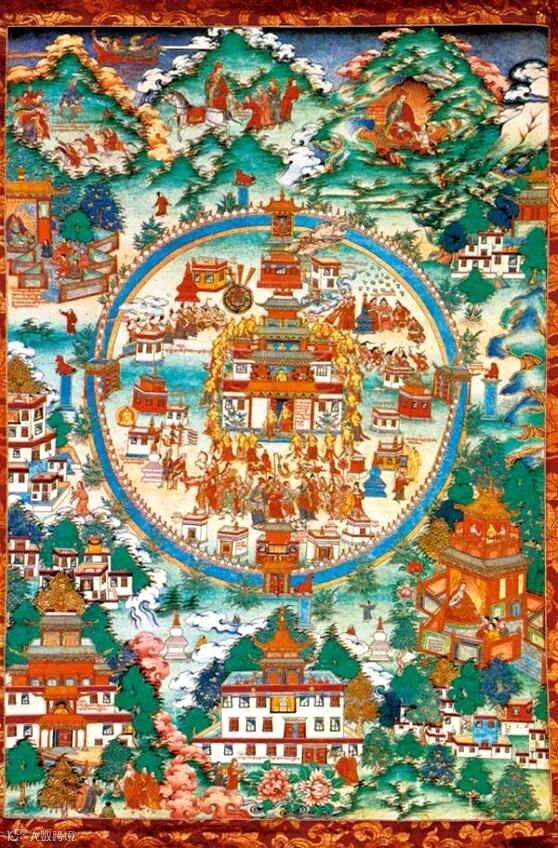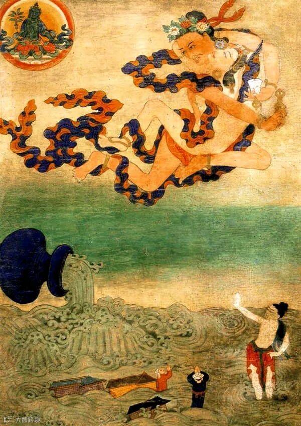 这幅唐卡描绘的是大成就者甘帝巴的一个著名的传说。甘帝巴在树林中修行,当地的国王想请他到王宫中接受供养,遭到大师的拒绝。于是,国王便派一个卖酒妇的女儿去引诱甘帝巴,最终大师被激怒。甘帝巴发下大水,唐卡下方描绘的就是这一场景。房屋被冲倒,而国王也站在水中合十祈祷。后来右下角的观音菩萨显现,才解除了这场灾难。