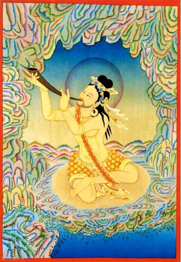这幅唐卡所绘的是那洛巴。那洛巴居于一个偏僻的山中世界里,穿着瑜伽士的服装,坐在一条带有斑点的动物皮垫之上,一条饰有精美图案的冥想带将他围在其中。那洛巴双手执起一支号角,放在嘴边吹响,这个动作可视为驱走无明、我执等妄念的象征,也可解释为那洛巴对其上师帝洛巴的称颂之举。