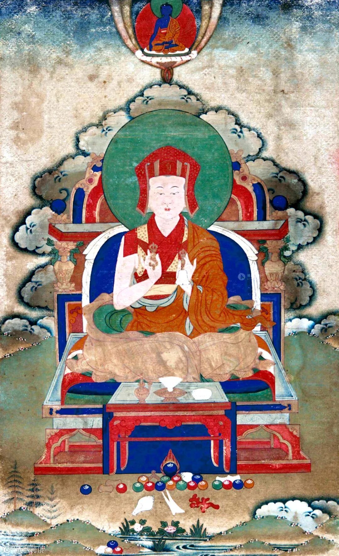 冈波巴(1079-1053年),法名索南仁千,因他长期在冈波山修行,因此被尊称为冈波巴。他早年从医,后来成为米拉日巴最著名的弟子。他融合了噶当派生起菩提心口诀,以及密宗大手印法,显密融通,自成一体,成为噶举派传承的建立者。此唐卡中的冈波巴被描绘成一位面庞宽大、娥眉小嘴、清秀睿智的年轻者。柔嫩的身体上穿着红黄相间,缀满花纹的长袍袈裟。右手持金刚杵,左手持金刚铃。坐在一个流线型低靠背的宝座上,靠背的后方烟云缭绕,前方有几案。主尊的上方为蓝色的不动佛,下方有低矮的山峦流水,并供有摩尼宝、海螺等宝物。这种年轻的冈波巴形象又被称为“月光童子”,在噶举派中十分流行。