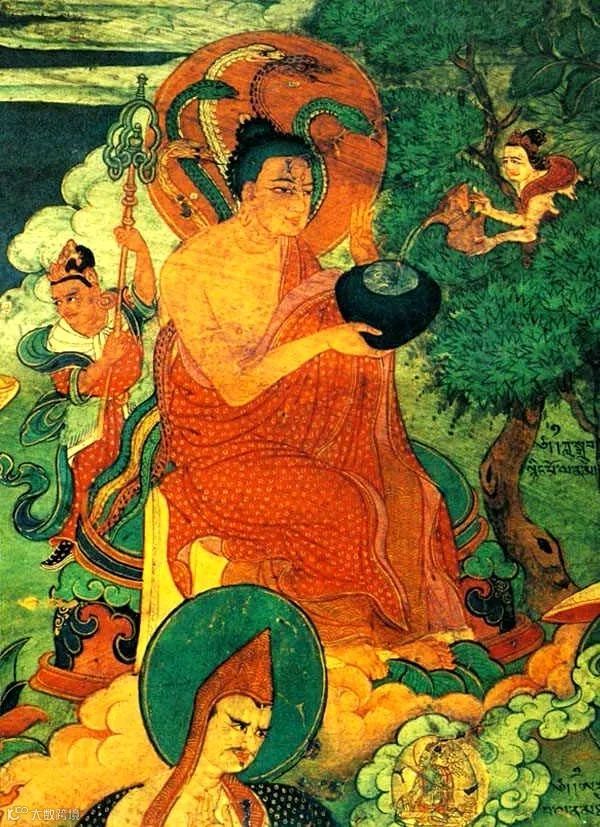 这幅壁画所描绘的是龙树菩萨。他身着僧衣,坐于树下,手托钵盂承接空行母倾注的甘露。龙树对于中国佛教的影响巨大,他的学说通过鸠摩罗什翻译并介绍到中国后,大乘思想得以显扬,而龙树菩萨也被中国汉地佛教八大宗派奉为祖师。