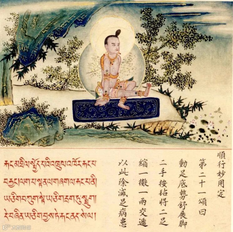 1 顺行妙用第二十一颂:“动足底势舒展脚,二手按毡将二足,缩一擞一两交递,以此除灭足病患。”“动足底势”对应藏文作:rkang mthil spyod pa'i 'khrul 'khor,意为:“调练足底之幻轮。”全颂若以白话散句或可译作:“调练足底之幻轮,伸展双脚,二手按着毡,一只脚弯曲收缩,另一只脚(伸出)急速抖动,双脚不停交替进行,此式能消除足部病患。”