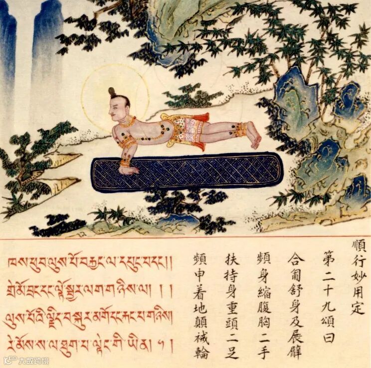 除了这五颂,尚有两颂仅在汉文颂文中同时出现了“轮”“乱轮”的称法,而在相应的藏文解说部分没有出现与之对应的词汇。一为顺行妙用第二十九颂:“合匍舒身及展臂,频身缩腹胸二手,扶持身重头二足,频申着地颠裓轮。”结合藏文,该颂以更加明白的语言或可表达爲:“俯身向下,舒展身体,双肘(紧绷),收缩腹部,以二手支撑身体的重量,头和双足轮流触地,是为‘颠裓轮’。”末尾的“颠裓轮”对应藏文部分仅作steng gi(“颠裓”即其音译),未出现与“轮”对应的词语。