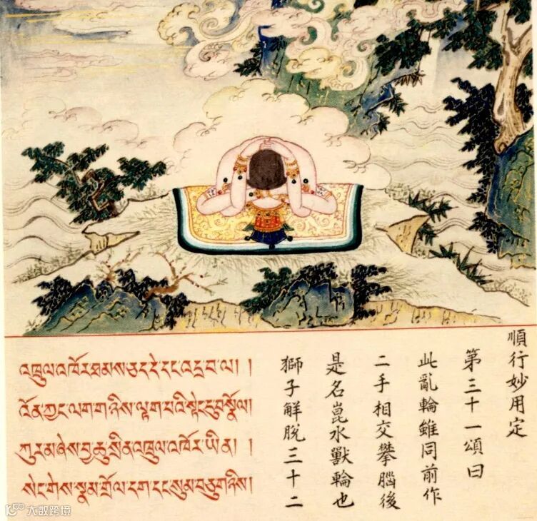 从以上这些用例来看,所谓“幻轮”均涉及身体动作,并且大都需要配合持气法。尽管《宫廷瑜伽》所传“三十二瑜伽妙用修习”的其他汉藏颂文中没有直接出现诸如“轮”“乱轮”或'khrul 'khor的字眼,但它们都属于幻轮修法之范畴。