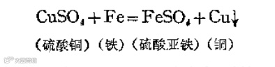 黄白卷还有这样一句话“以曾青涂铁,铁赤色如铜。”曾青是蓝色的硫酸铜溶液,涂在铁器上,就可发生如下取代反应: