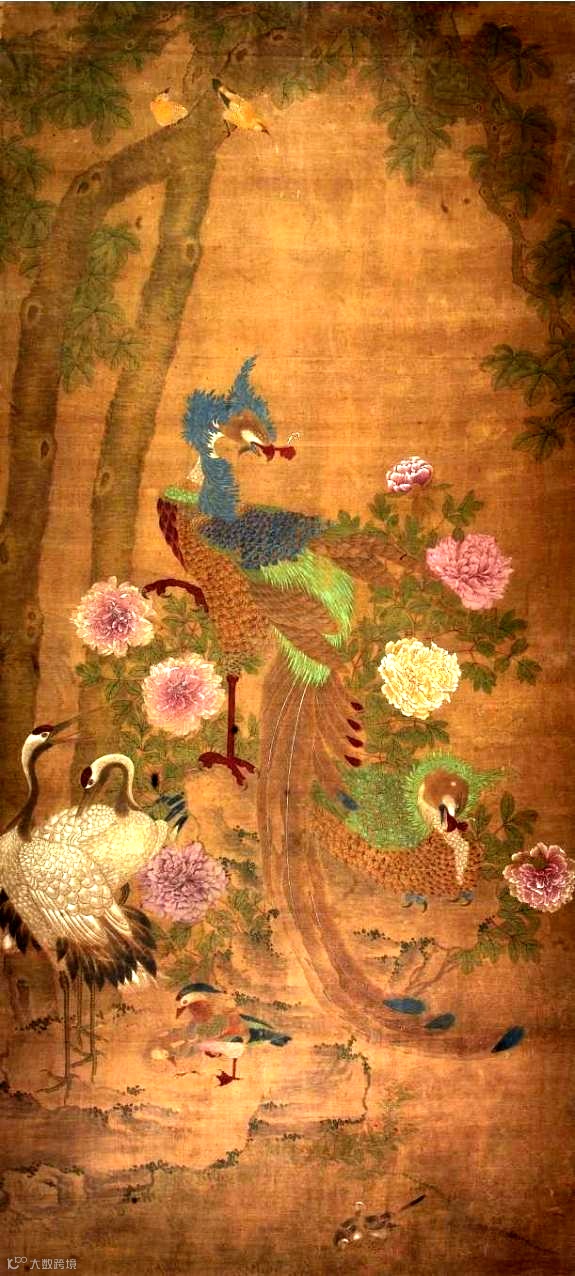 宋代《凤凰图轴》。凤凰单脚站立,眼神犀利,有王者风范。周围陪衬有牡丹、丹顶鹤、鸳鸯等。