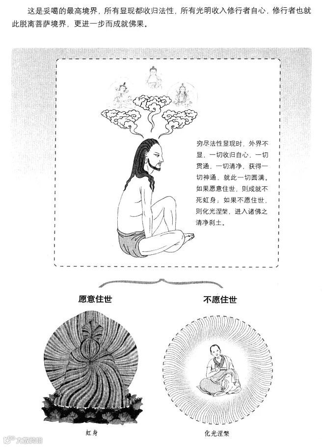这是第四阶段,外面一切显现,尽收归自心,行者圆满修成光明虹体。