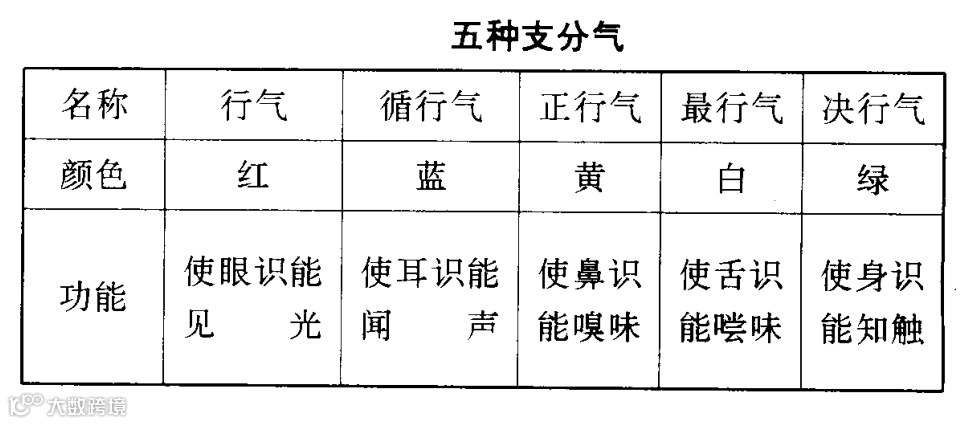 五支分气是由住于心轮中央的命气所分支发岀, 它们各流入感官入口,使各识能找到自己的目标。五种支分气的颜色,代表五大元素,即地、水、火、风、空。