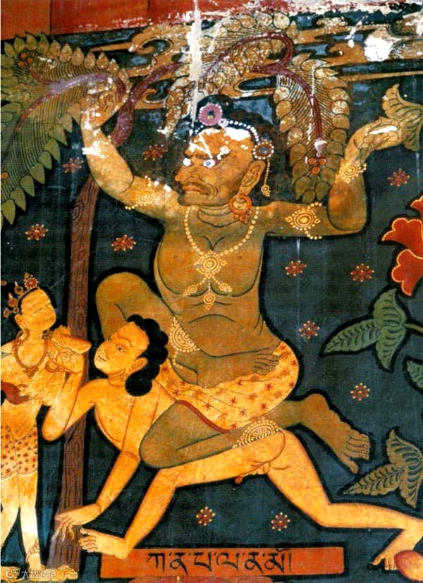 这幅壁画所绘的是那波巴大师。他骑在一个裸体男子的背上,面现怒容,居于一棵大树之下。那波巴的身边站着两位空行母,一个肤色明亮,一个肤色黝黑。空行母的手中托着一只嘎巴拉。那波巴身下为一具起尸,他伸出右手欲将碗接过来。