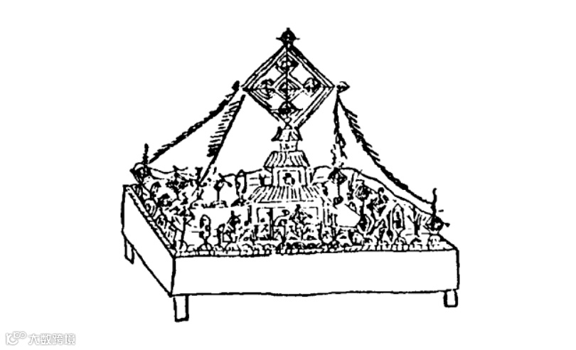 大部分的“幻网”基座是四层或三层,它与一座佛塔的外观有惊人的相似之处,象图1的“幻图”基座,就是一种三层的小建筑。在小建筑的内部放有某人的赎罪物(见图2),这是人的形象的模制品,用糌粑和酥油做成,作为一种朵玛来使用。小建筑的四周是彩盘,放有象征财宝的小块布块、各色石子、小的兵器和铠甲(用面制作而成)。此外,彩盘上还有八种吉祥的标志以及陆地、水上和驯养动物的象征物。周围有水果和谷物。这些供品被认为是旅行必需品的代表物,同时还被认为是向制造灾难的神祗还债的供品。