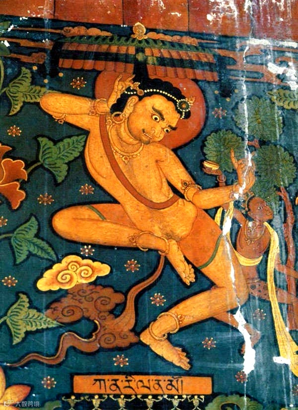 这幅壁画所绘的是圣天菩萨。壁画中的圣天菩萨并未着僧衣,说明这是他还未出家时的情景。他与身边的明妃一起舞动着身体,两者的姿势极为相似。明妃手中托着嘎巴拉,以供养圣天菩萨。对于这幅唐卡的解析,也存在另外一种意见,有学者认为图中所绘的并非圣天菩萨,而是八十四大成就者中的另外一位。
